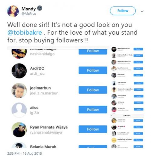 The user wrote: “Well done sir!! It’s not a good look on you @tobibakre. For the love of what you stand for, stop buying followers”, while sharing supposed screenshots of the fake Instagram accounts following him.