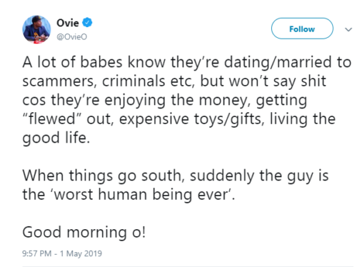 A lot of babes know they’re dating/married to scammers, criminals etc, but won’t say poo cos they’re enjoying the money, getting “flewed” out, expensive toys/gifts, living the good life. When things go south, suddenly the guy is the ‘worst human being ever’. Good morning o!