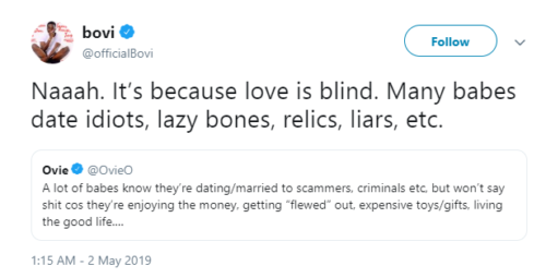 Bovi who defended Tonto Dikeh in the ongoing conversation about her marriage which ended, stated that love is blind and ends up making ‘many babes date liards, idiots and lazy bones’. Recall that Tonto Dikeh had accused her ex-husband, Olakunle Churchill of being a fraudster, who uses diabolic means to make money.