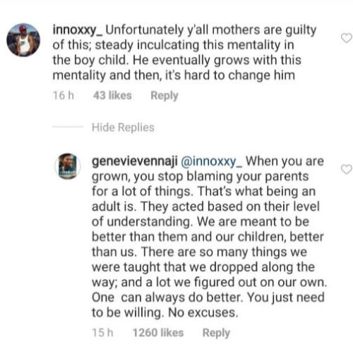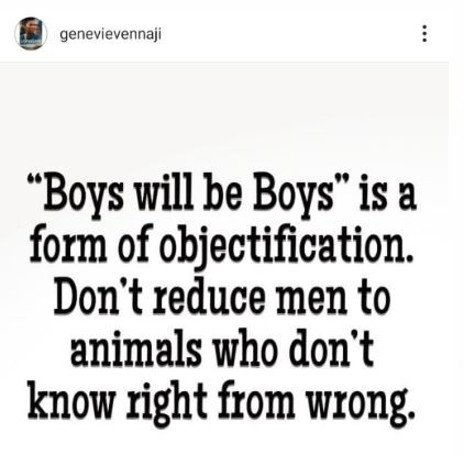 Actress, Genevieve Nnaji shared a post on her Instagram page that reads, ‘boys will be boys’ is a form of objectification, Don’t reduce me to animals who don’t know right from wrong. Brothers, you can rise above the stereotype’.