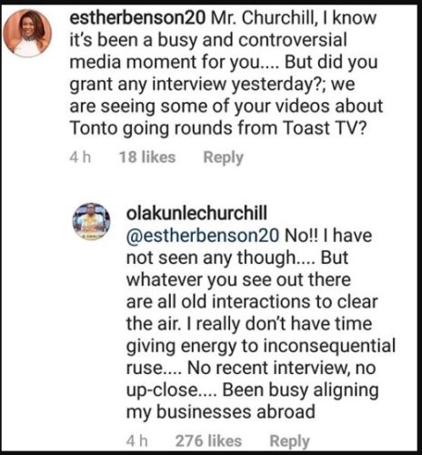 Olakunle Churchill, Tonto Dikeh’s ex-hubby, denies granting any recent interview that could have triggered her recent outburst but admits that she must have seen an old interview he granted.