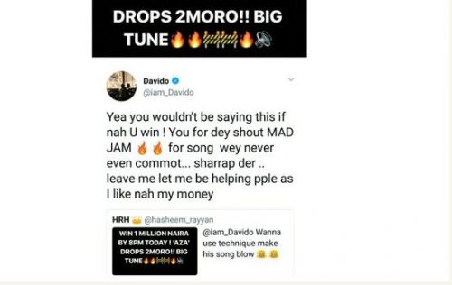 Nigerian singer who dropped another song tomorrow Titled “Aza” was called out by a twitter user for giving out N1million to a fan just like that says Davido is using the technique to make his song “blow”.