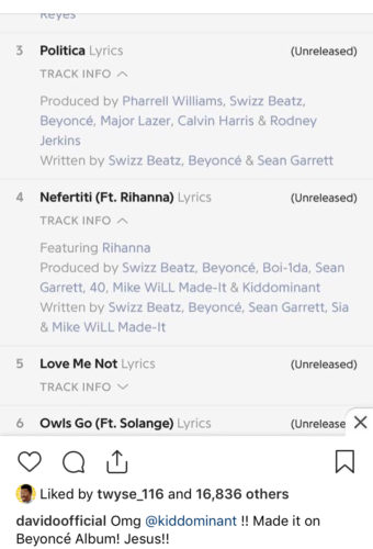 Davido Excited As Kiddominant Is On New Beyonce Album ‘B7’ Hinted At Online