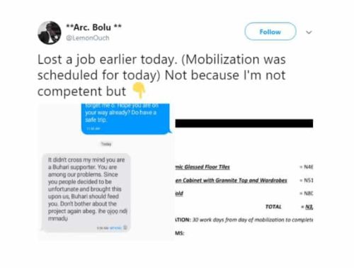 A Nigerian man simply identified as Architect Bolu, took to social media to narrate how he lost a N3.4 million contract because he is a die-hard supporter of the Buhari-led administration.
