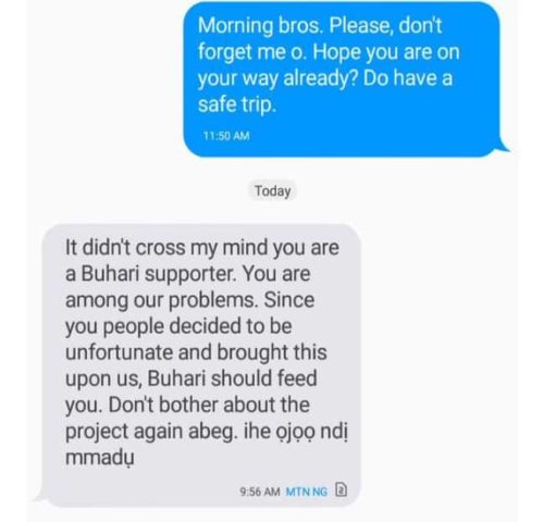 The young man shared the text message he got from the client that awarded him the contract, calling off the contract. The client in the text message asked him to go and meet President Buhari to feed him.