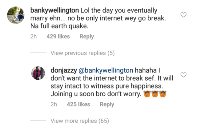 When Banky W responded saying the day he gets married, he won’t only break the internet but cause an earthquake, Don Jazzy replied, saying he doesn’t want the internet to break but just witness pure happiness.