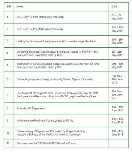 NYSC 2019 Batch B Official Mobilization Timetable Is Out