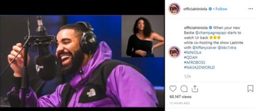 The Nigerian singer has taken to Instagram to react. Drake who demanded for Niniola’s hit song ‘Maradona’ to be played on the radio show, and Niniola who reacted via Instagram called him her ‘new bestie’. She wrote as she shared the video;