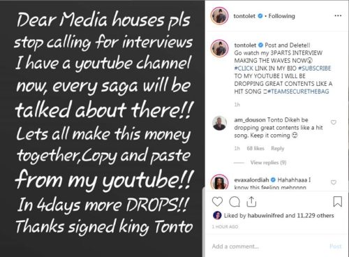 The Nollywood Actress, Tonto Dike has told media houses to stop calling her for interviews, writing that she created a new youtube page where she will be dropping videos of every saga there so that she can make money from them too.