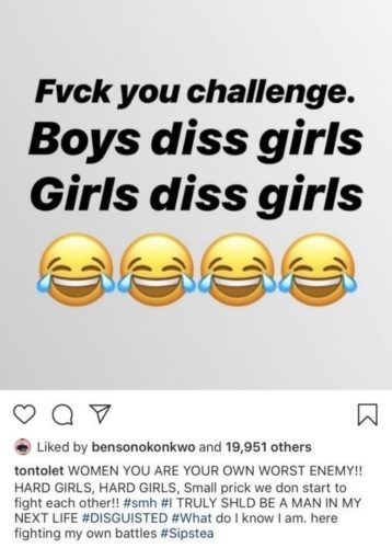 ‘women, you are your won worst enemy. Hard girls, hard girls, small prick we don start to fight each other!! I truly should be a man in my next life #Disgusted #What do I know I am. here fighting my own battles’.