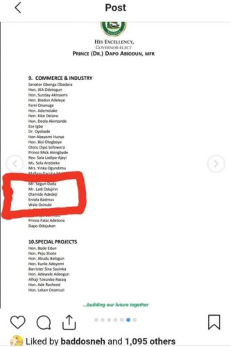The list was released by the incoming governor who will be taking oath in few weeks time in Ogun State.