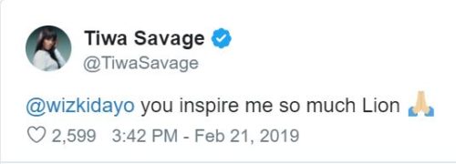 Nigerian songstress, Tiwa Savage has once again proven her love for Wizkid as she took to Twitter to praise him.